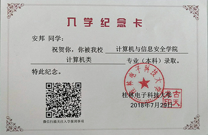 ——記好孩子學校優(yōu)秀畢業(yè)生安邦被桂林電子科技大學錄取