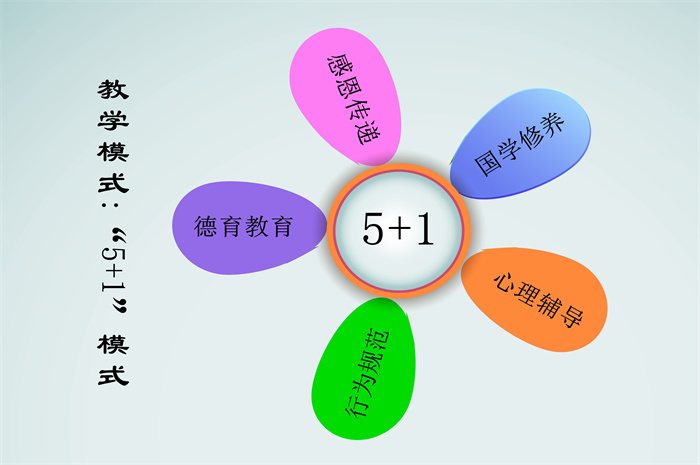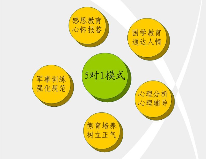 安寧好孩子學(xué)校5對(duì)1教育模式模型圖:感恩教育、心懷報(bào)答國(guó)學(xué)教育、通達(dá)人情行為訓(xùn)練、強(qiáng)化規(guī)范心理分析、心理輔導(dǎo)德育培養(yǎng)、樹(shù)立正氣