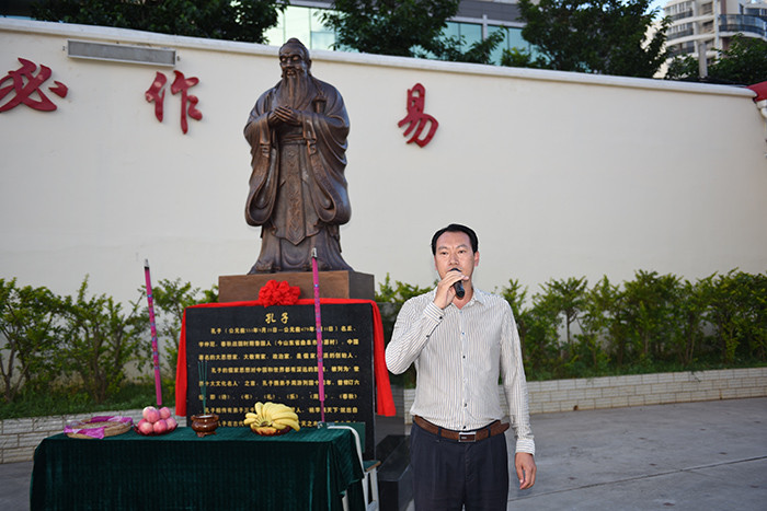 晚餐前,全體師生莊嚴(yán)地站在操場上,跟隨魯植校長一起祭拜孔子雕像。魯校長說道:“祭拜孔子雕像,不僅僅要表達(dá)對孔子的崇敬之情,更在于可以時時刻刻提醒我們要立德修身、勤而好學(xué),繼承和發(fā)揚(yáng)中華民族的優(yōu)良傳統(tǒng)。我們要以孔子的智慧和人格為標(biāo)尺,丈量每天的進(jìn)步與成長,去遇見更好的自己!痹谇f重而簡樸的儀式下,孩子們深切感受到了傳統(tǒng)文化的魅力。