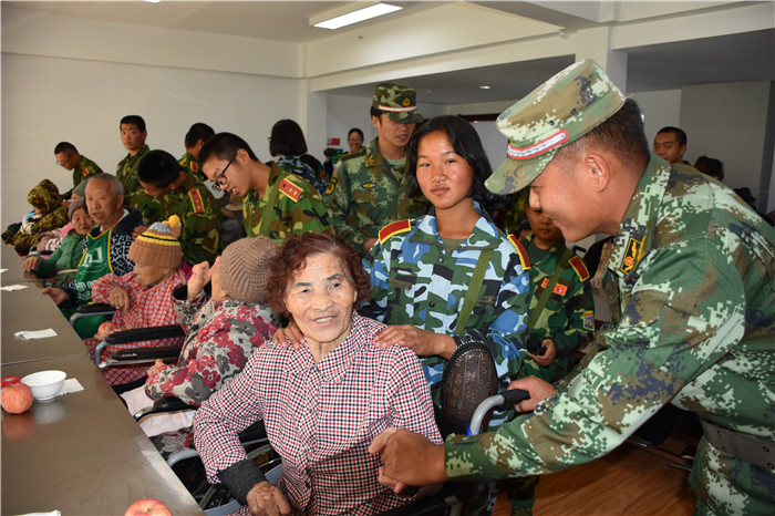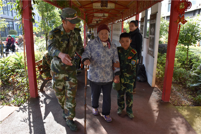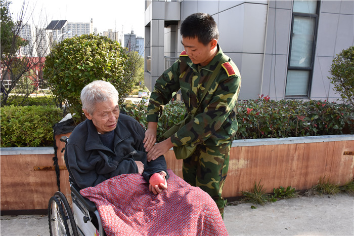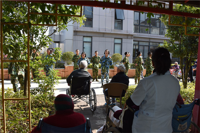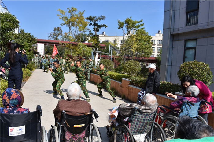 到了敬老院同學(xué)們立馬給老人們送上了蘋果,還主動(dòng)到老人身邊扶著老人散步、推著輪椅陪老人看風(fēng)景、陪老人們聊天、給老人們按摩,一張張稚嫩的笑臉和一雙雙慈祥的目光碰撞出“家”一樣的和諧、溫馨。聽說老人們喜歡看表演,孩子們就為老人們唱起了軍歌、表演了軍體拳、跳手語舞、演奏葫蘆絲等。豐富的節(jié)目博得了老人們的好評(píng),掌聲不斷響起,幾位老奶奶也開心地送上了自己的拿手表演,整個(gè)院兒里充滿了掌聲和歡笑聲。