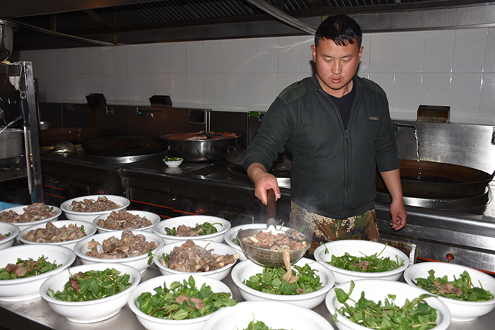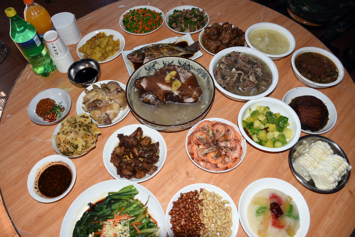 為了準(zhǔn)備豐富的年夜飯,老師和同學(xué)們從上午就開始忙碌著,一起幫學(xué)校廚師們打下手。同學(xué)們有的撿菜,有的洗碗,有的洗菜......到了下午,一盤盤色香味俱全的菜肴就呈現(xiàn)在大家面前,伴隨著隆隆的鞭炮聲,年夜飯開始了。