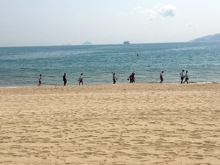 7日上午,孩子們又跑到海邊游泳,這或許是云南孩子特有的情愫。有的孩子穿著薄衣薄褲一步一步地邁入海中,眺望遠方冉冉升起的太陽;有的又在海灘上狂熱地戲海逐浪;有的懶洋洋的躺在沙灘的躺椅上,瞇眼斜看著流金溢彩的沙灘,聽潮起潮落,一點也不擔心會被曬黑,甚至還有種想把自己曬得一身古銅色的小愿望。