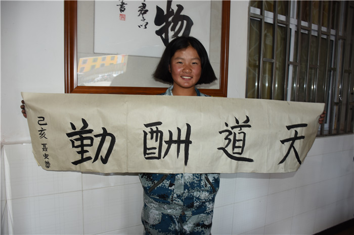 比賽尾聲,魯校長還把孩子們中間寫的好的書法裝裱,拿到現(xiàn)場展示,勉勵孩子們要向榜樣學習:“同學們,這是你們的同學寫的書法,他們就生活在你們中間,離你們并不遙遠。他們入校時也和大家一樣,什么都不懂,甚至連如何握筆都不知道,但經(jīng)過幾個月的學習,進步顯而易見。不但字寫得好,而且心境也更加寧靜平和。我常常和大家說‘練筆,就是練心’,一個人如果僅僅把字練得爐火純青,他也只能成為‘書匠’,只有把握中華文化這個根基、深入體會中華文化中詩書禮樂的共性、領會經(jīng)典與美學的意義,才能可能成為真正的大師。所以,我也希望同學們能在這里靜下心來,好好學習,寫端端正正中國字,做堂堂正正中國人!”