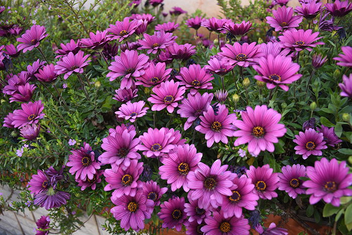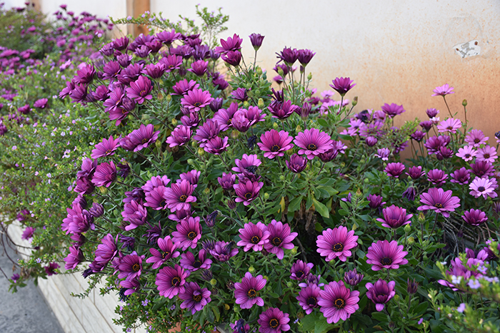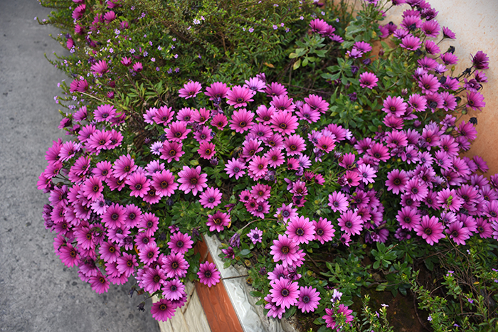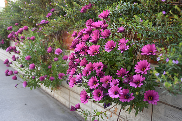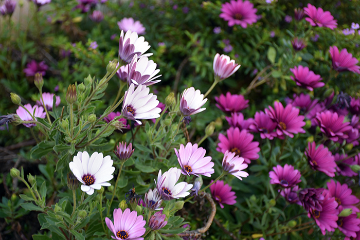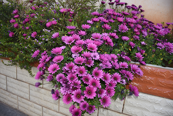 非洲雛菊最先吹響了春天的號角,攜來一抹春意。幾棵粉的,因為陽光青睞,恩澤也多一些,開得熱烈奔放;幾棵白的,因為高棵的遮擋,就略顯矜持,輕啟朱唇,似笑還羞的樣子;而就數(shù)紫的,在浩蕩春風的吹拂下,都欣欣然睜開了眼,伸著懶腰,迫不及待的嶄露頭角。