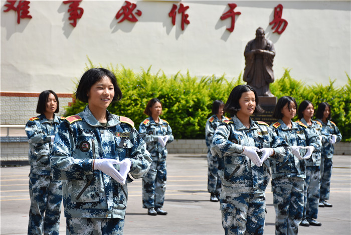 基本的隊(duì)列表演完畢后,女生方隊(duì)進(jìn)行了手語(yǔ)操《厚德載物》和女兵操《請(qǐng)不要叫我女孩》的表演,鏗鏘亦溫柔,舉手投足間煥發(fā)出勃勃生機(jī),將會(huì)操表演推向了高潮。男生方隊(duì)也毫不遜色,擒敵拳、匕首操更是勢(shì)如霹靂,強(qiáng)健的體魄展現(xiàn)出堅(jiān)定的意志,自律自強(qiáng)的品質(zhì)中綻放出青春的色彩,展現(xiàn)了當(dāng)代軍人的風(fēng)采。