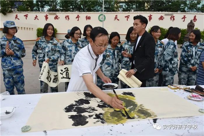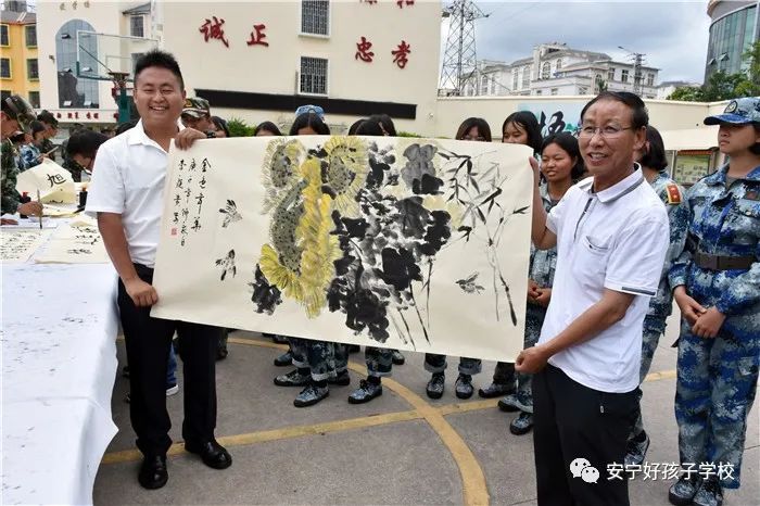 聯(lián)誼匯演結(jié)束,聽說老領(lǐng)導(dǎo)們都身懷絕技,在繪畫、書法上都頗有造詣,孩子們豈能錯過這樣的好機(jī)會,迫不及待地與老師一起把筆墨紙硯準(zhǔn)備好,列隊等著觀摩學(xué)習(xí)。李主任、“五老”鄧成列、徐繼泉等領(lǐng)導(dǎo)不辭辛勞,現(xiàn)場毫不吝嗇地?fù)]毫潑墨,只見筆墨飛舞間,一幅幅遒勁有力、氣勢非凡的的書法作品和活靈活現(xiàn)的《向日葵》水墨畫躍然紙上,呈現(xiàn)在大家眼前,令人賞心悅目,師生們贊不絕口,力量倍增。