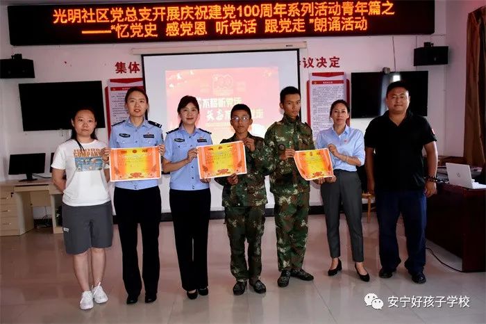 為隆重慶祝中國共產(chǎn)黨百年華誕,深入推進黨史學習教育,傳承紅色文化,厚植愛國情懷,2021年5月14日,我校選派3名學生到光明社區(qū)參加“憶黨史 感黨恩 聽黨話 跟黨走”朗誦比賽活動。