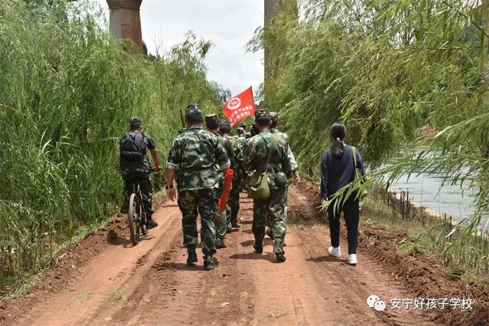 上午八點,全體學(xué)員迅速集合,背著行軍包,挎著小水壺,整裝待發(fā)。跟隨著一聲清脆的“出發(fā)”口令,同學(xué)們歡呼雀躍地開啟了旅程。孩子們沿著螳川河畔,順流而下。途中,學(xué)校還特意安排兩輛車拉上補給,緊隨同學(xué)們身后,認真做好充分的后勤保障工作。教員更是按1:2比例全程陪同。