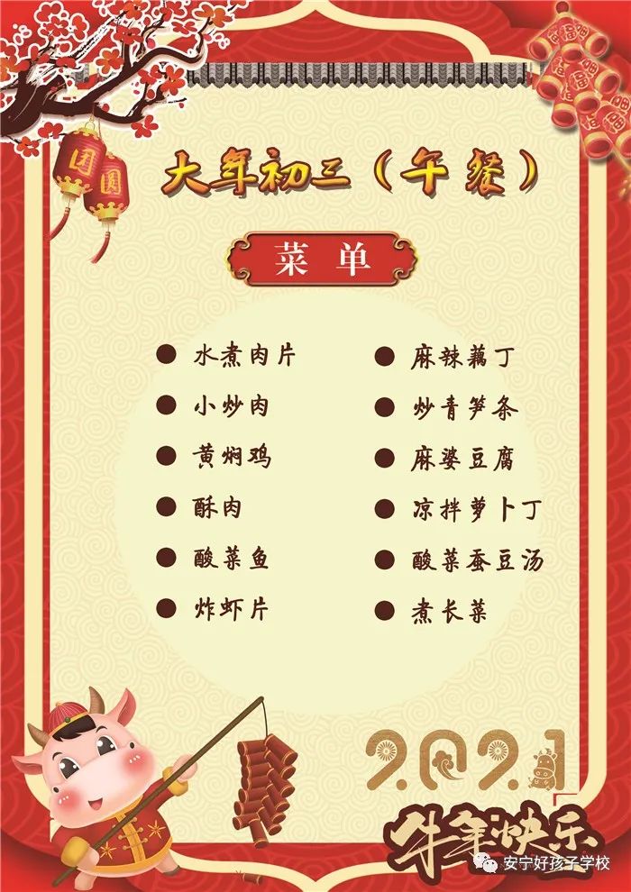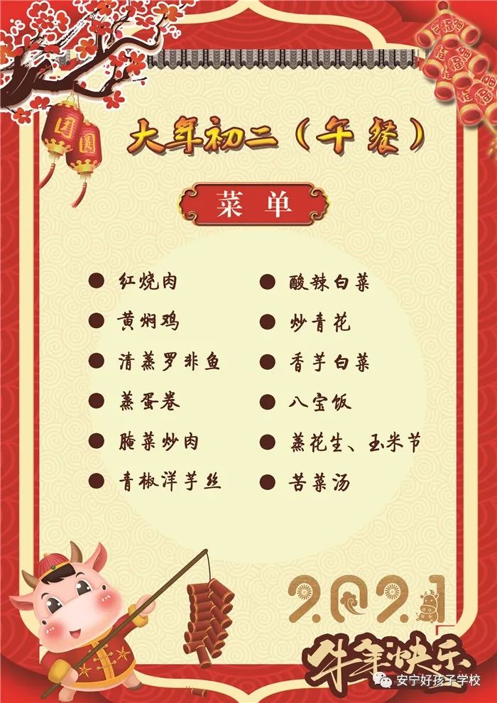 過年了 !孩子們吃什么?這是學(xué)校領(lǐng)導(dǎo)幾天來一直思考的問題。經(jīng)過與學(xué)校營養(yǎng)師、食堂廚師們多次商議后,本著營養(yǎng)、健康、不浪費(fèi),又要保證孩子每餐都能吃上新鮮可口的飯菜,終于議定了菜單,現(xiàn)予以公布。祝孩子們新年快樂!祝全體家長萬事如意!