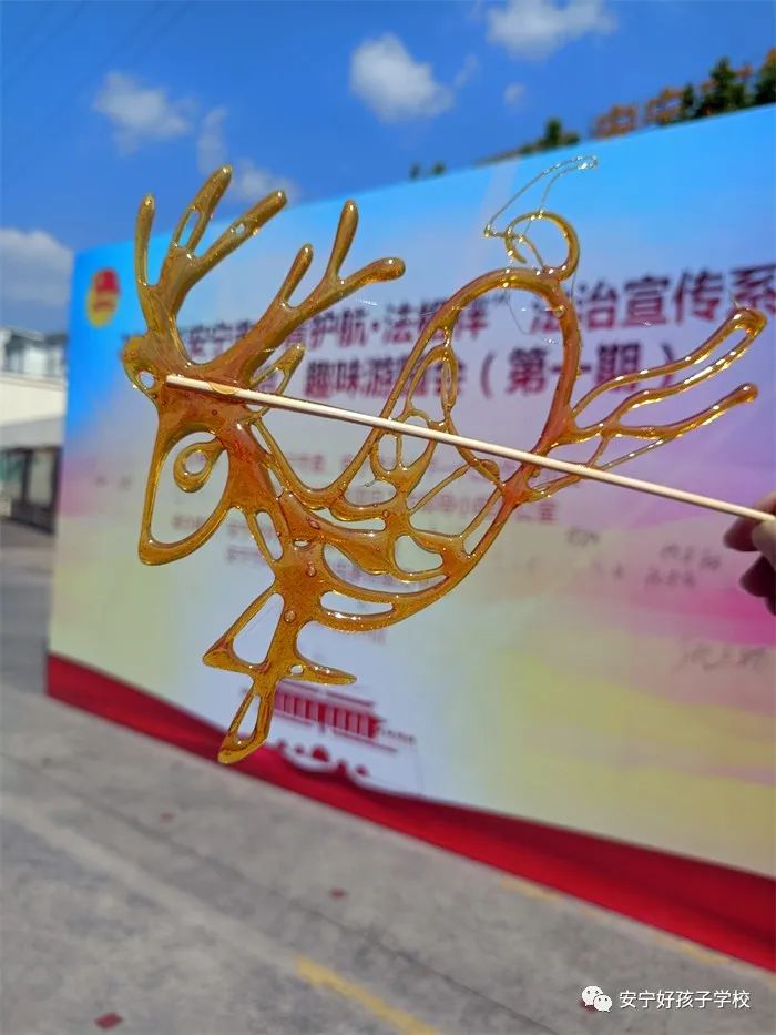 在每個(gè)游戲中,同學(xué)們都努力集齊“青護(hù)航,法相伴”六個(gè)字,完成游戲打卡的同學(xué),歡天喜地的到禮品兌換點(diǎn)兌換甜蜜糖畫,一時(shí)間,兌換點(diǎn)的糖人泥人供不應(yīng)求。大家一邊吃著糖人,一邊在簽名墻上留下自己的名字!疤钱嬏鹪诖介g,知識記在心里”。《中華人民共和國預(yù)防未成年人犯罪法》、《中華人民共和國未成年人保護(hù)法》等相關(guān)法律法規(guī)貫穿游戲始終,同學(xué)們在玩中學(xué),在學(xué)中樂,無形中強(qiáng)化了同學(xué)們的法律意識,增強(qiáng)了法治觀念。