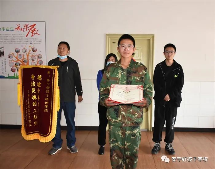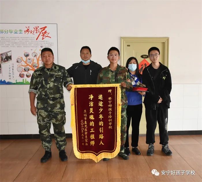 2022年5月4日,我校學(xué)生李昱峰順利畢業(yè)。在出營(yíng)儀式上,他的家長(zhǎng)將繡有“迷途少年的引路人,凈潔靈魂的工程師”字樣的錦旗贈(zèng)給學(xué)校,以此感謝學(xué)校和老師對(duì)孩子的辛勤培育,學(xué)校教務(wù)主任張汝云代表學(xué)校接過了這面沉甸甸的錦旗。