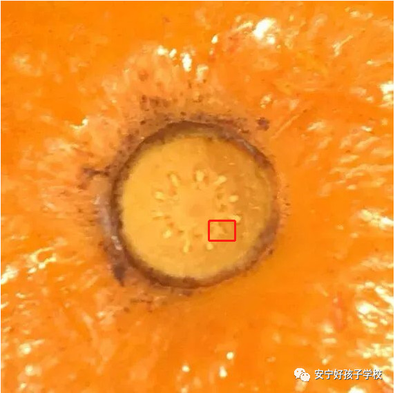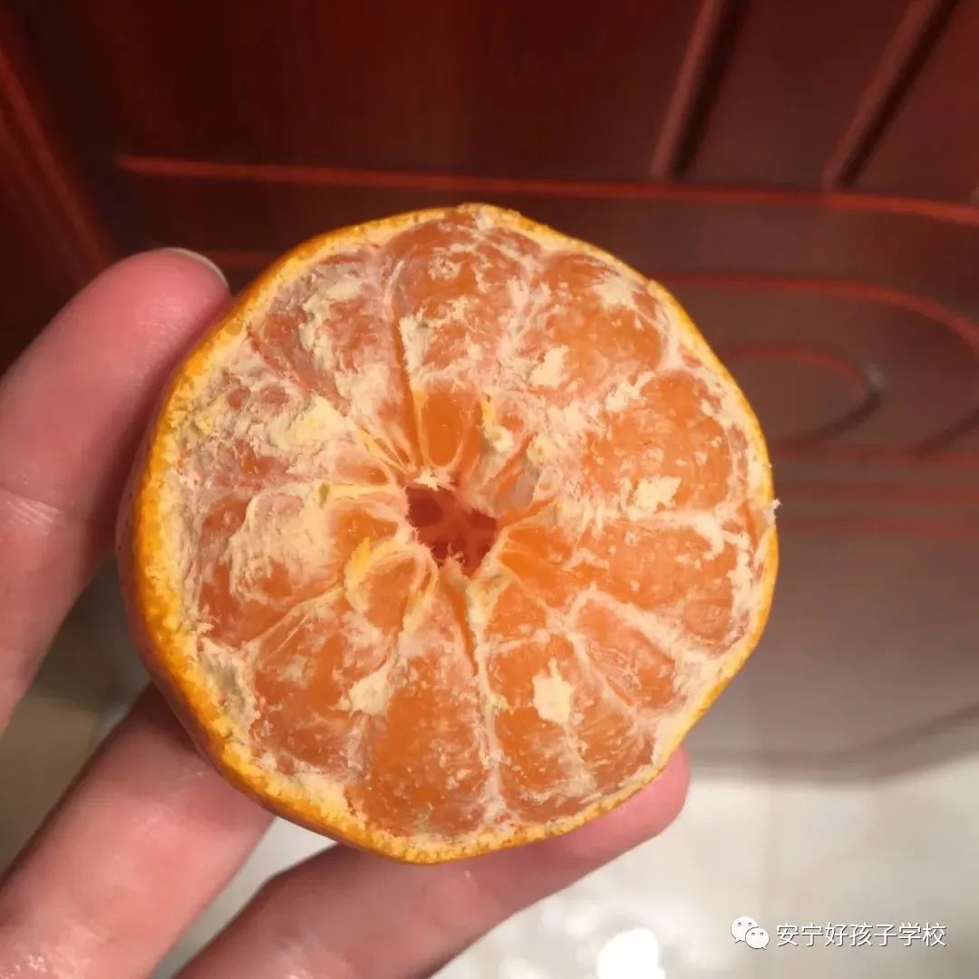 最后一個(gè)實(shí)驗(yàn)是不剝開(kāi)橘子皮,猜橘子的瓣數(shù)。同學(xué)們拿起橘子認(rèn)真觀察,左看右看,轉(zhuǎn)著圈看,瞇著眼看,對(duì)著光看......或猶豫或堅(jiān)定地說(shuō)出自己猜的數(shù)字,然后剝開(kāi)橘子看是否和自己猜的數(shù)字吻合。同學(xué)們有的猜對(duì)(或者說(shuō)是蒙對(duì)),有的相差較大,但老師卻一猜一個(gè)準(zhǔn)。正當(dāng)同學(xué)們非常好奇老師是怎么做到的時(shí)候,老師便為大家揭曉答案:每個(gè)橘子上都有個(gè)綠梗,將橘子蒂頭整個(gè)剝掉,能看到一圈小白點(diǎn),白點(diǎn)多少個(gè),橘子就有多少瓣(但若發(fā)現(xiàn)2個(gè)白點(diǎn)中間空出一個(gè)位置,或有那種似有非有的白點(diǎn),大可能就是沒(méi)發(fā)育好的橘子瓣)。同學(xué)們恍然大悟,原來(lái)小小的橘子里面還隱藏著這樣的奧妙呢!