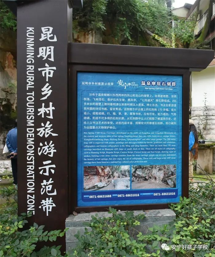 不知不覺間來到了溫泉小鎮(zhèn)摩崖石刻群,上面匯集著從明代至民國年間云南和全國詩書畫名師大家游覽溫泉留下的題詞、詩歌、碑銘、壁畫和書法集錦。古韻十足的摩崖石刻,引得同學(xué)們駐足觀看,在驚嘆大自然鬼斧神工的同時(shí),也不忘仔細(xì)揣摩石崖上鐫刻著的詩詞書畫,觀之既能讓人了解溫泉?dú)v史,又給人以藝術(shù)美的享受。