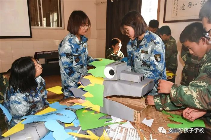 緊接著,同學(xué)們利用廢舊紙盒、卡紙和彩色氣球等原材料自主設(shè)計(jì)心目中的“祥龍”。大家奇思妙想,開動(dòng)腦筋,既有分工,又有合作。有的制作龍頭,剪一剪、畫一畫、粘一粘;有的制作龍身,賣力地吹著氣球,認(rèn)真地綁著。很快,一條栩栩如生、五彩奪目的祥龍便呈現(xiàn)在大家眼前。