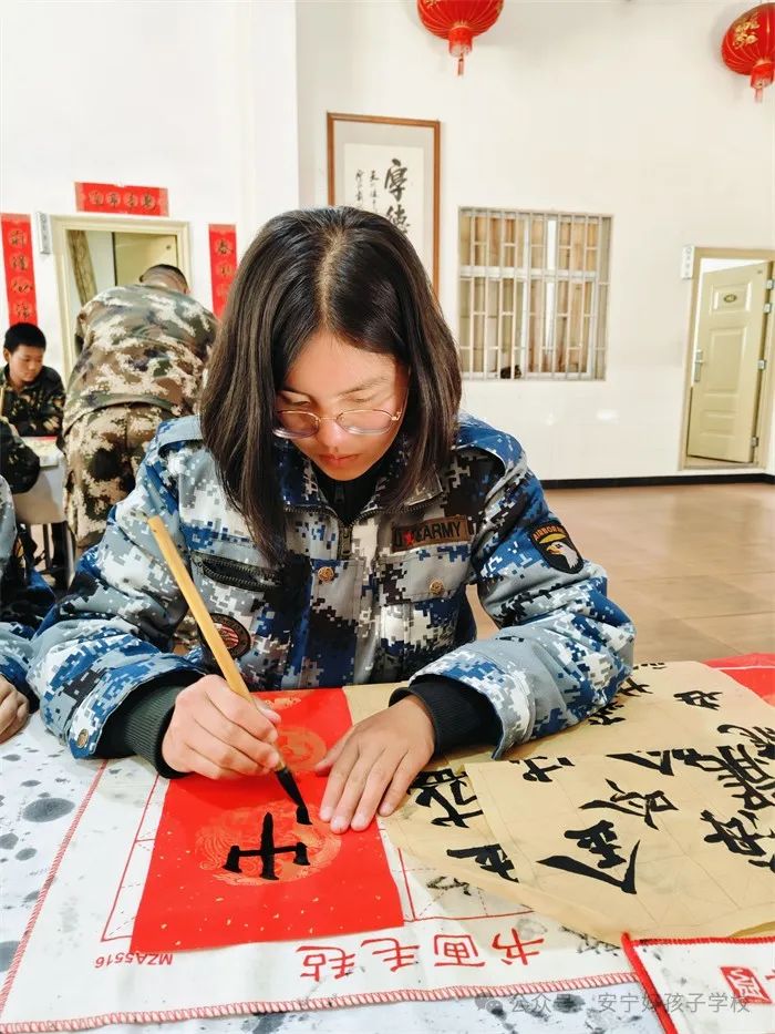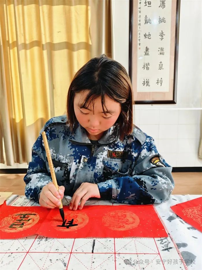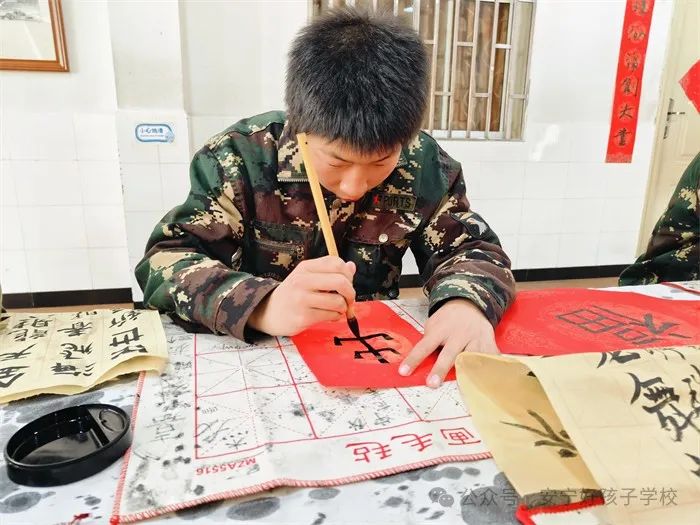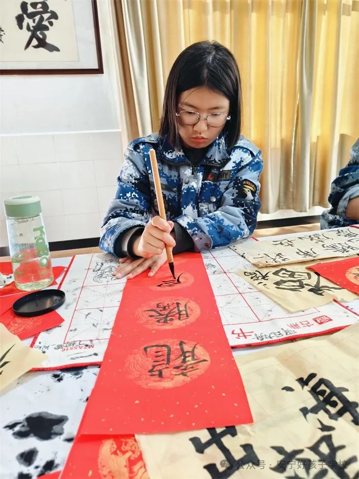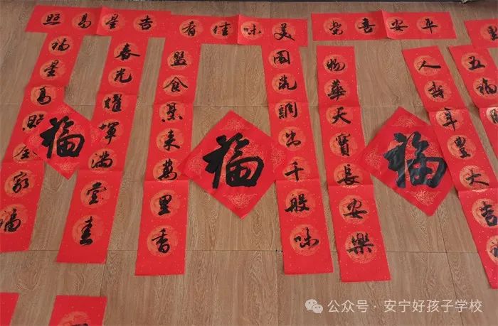 在窗明幾凈的多功能室里,翰墨飄香,福氣滿堂,孩子們徜徉其中,用心地選聯句、飽蘸濃墨、潤圓筆鋒、提筆揮毫。經過2個多小時的奮筆疾書,孩子們都完成了屬于自己的春聯作品!按号R大地花開早,福滿人間喜事多”“日麗神州彩鳳舞,霞飛華夏巨龍騰”“天地人四海同春,松竹梅三陽開泰”“一帆風順年年好,萬事如意步步高”等滿載祝福的春聯躍然紙上。隸書的有折無轉、楷書的齊而不拘、草書的筆畫連綿、行書的悠游流轉......大家筆走龍蛇,作品行云流水,都肆意地將心底最美好的祝愿化作一幅幅寓意吉祥的作品,在漢字的線條美與結構美之中傳遞著濃郁的辭舊迎新、接福納祥的新春祝福。