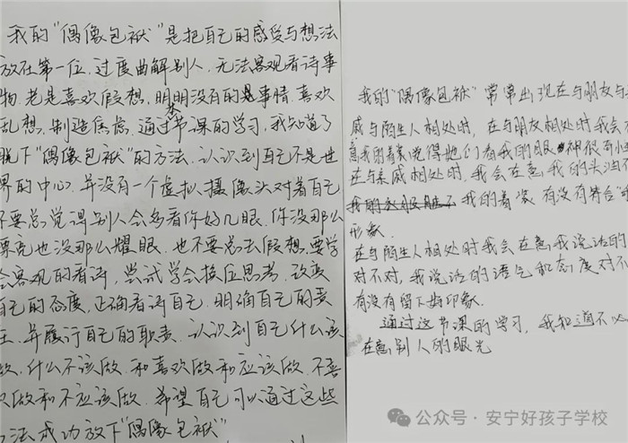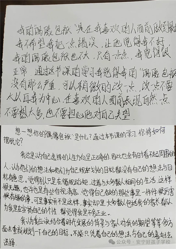 最后,在“我的偶像包袱”課程作業(yè)中也體現(xiàn)出了孩子們的收獲。有的孩子為自己以前總要求父母、朋友圍著自己轉(zhuǎn),把他們的好當(dāng)做理所當(dāng)然而感到后悔,表示以后會盡量學(xué)著“己所不欲,勿施于人”;有的孩子想起自己以前太過在意別人的看法與議論,非常在意形象,浪費了很多的時間,現(xiàn)在會嘗試著把更多的精力和時間放在自己該做的事情上;還有的孩子發(fā)現(xiàn)自己總會把自己的缺點和別人的優(yōu)點做對比,把自己放在了很低的位置,而通過本節(jié)課的學(xué)習(xí),發(fā)現(xiàn)了自己也有很多優(yōu)點,對自己的認(rèn)識更進一步。