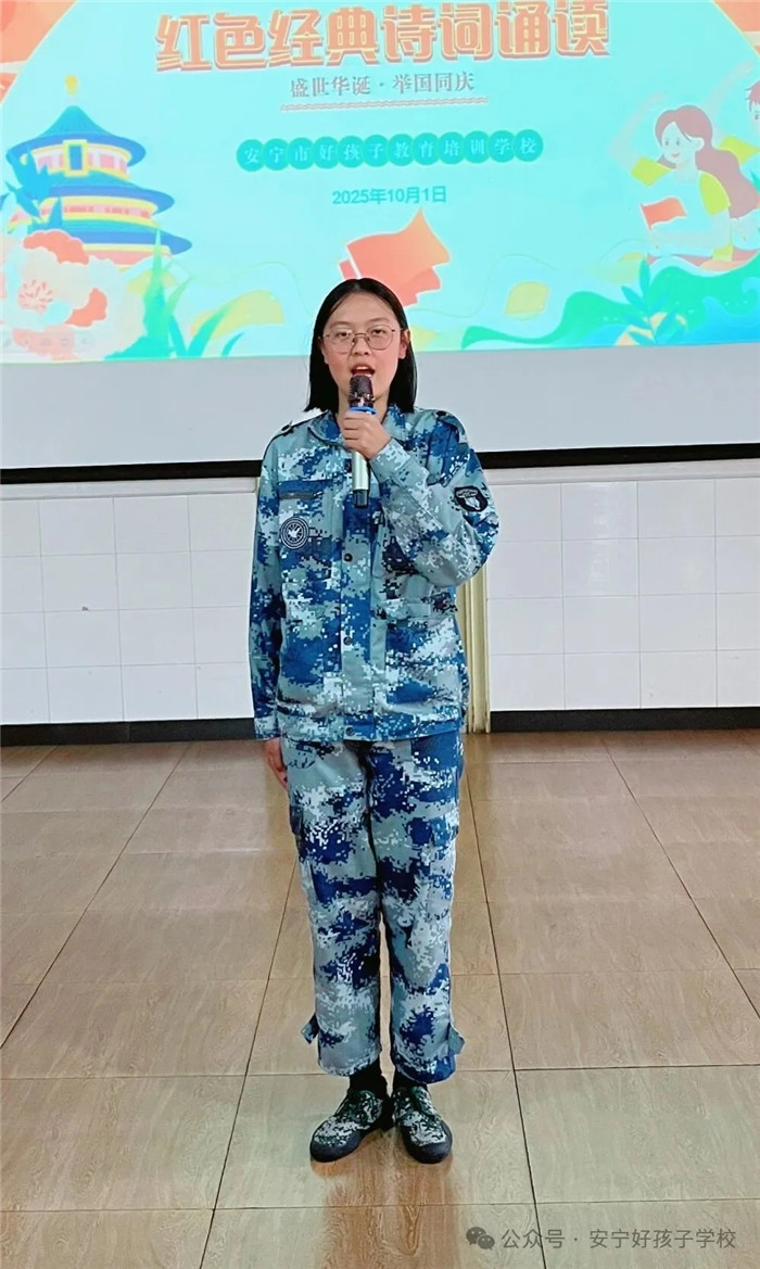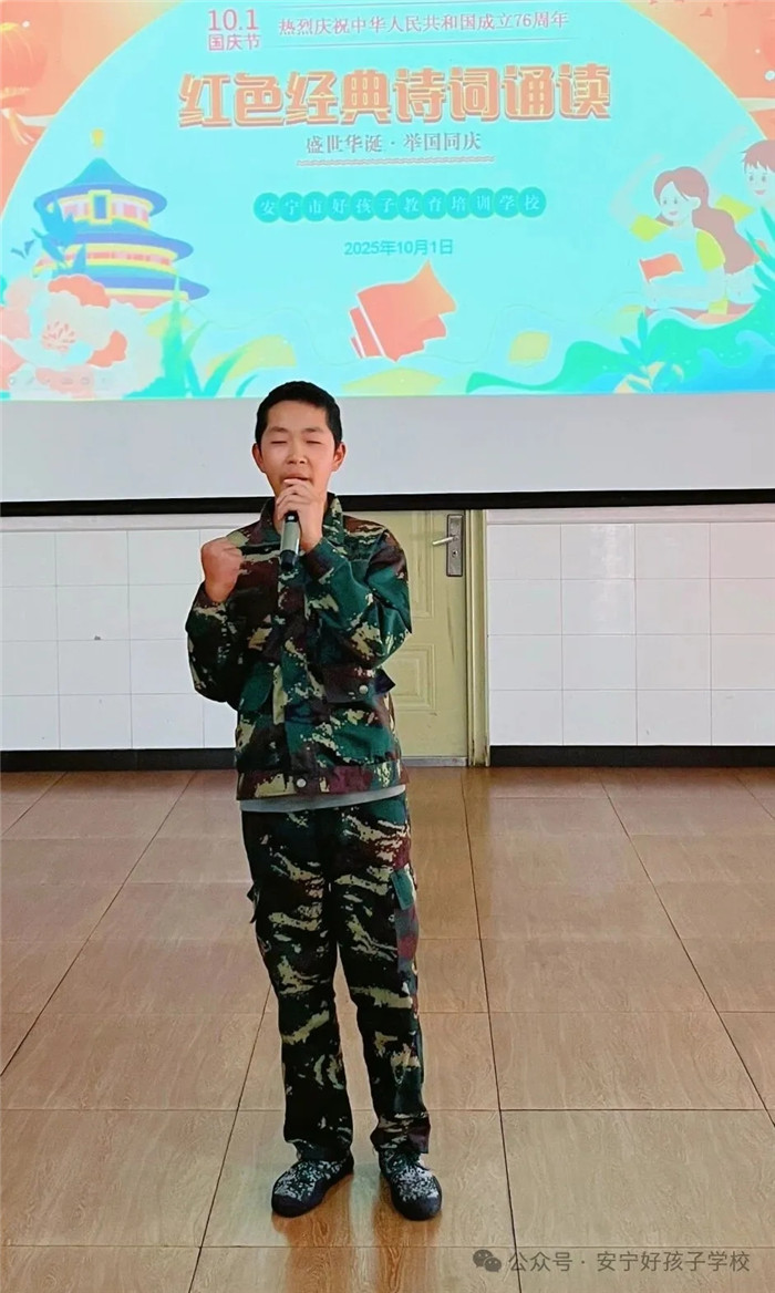 隨后的“紅色經(jīng)典詩詞誦讀”活動同樣精彩紛呈。從《沁園春·雪》的豪邁壯闊,到《七律·長征》的堅韌不屈;從《少年中國說》的朝氣蓬勃,到《我驕傲,我是中國人》的熱血沸騰...... 同學(xué)們或獨誦、或合誦,搭配生動的肢體語言與情感飽滿的語調(diào),將詩詞里的紅色故事娓娓道來。臺下師生仿佛穿越時空,在朗朗書聲中重溫革命歲月,讓紅色文化浸潤心靈。